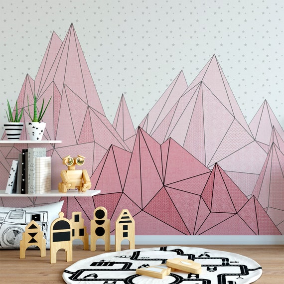 Mountain Wallpaper Woodland Wallpaper Geometric Pink Mural Wallpaper Triangle Polygon Kids Wallpaper Removable Wallpaper W1085